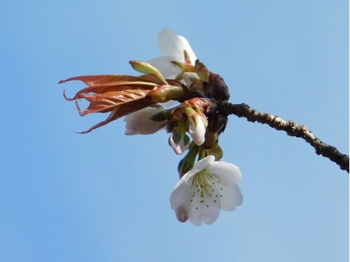 ヤマザクラ 2019年3月 兵庫県宝塚市 昨夕、市内のヤマザクラが数輪開花してました! 高いところにしか花がないので、こんな写真だけですが、証拠ということで。 ただ、この木が本当にヤマザクラなのか、100%の自信はありませぬ。某施設前の植栽木です。周囲…